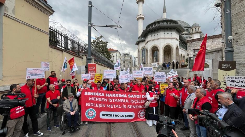 Mersen işçileri grevlerinin 40. gününde Fransız sermayeli şirketin yaptığı sendikal baskıları, Çalışma Bakanlığı müfettişleri tarafından da tespit edilen üretimi sürdürmeye yönelik usulsüzlükleri, şirketin mahkeme ve yasa tanımaz sendika düşmanı tavrını protesto etmek için Taksim’de buluştu. Meydandan Fransa İstanbul Başkonsolosluğu önüne yürüyen işçiler hazırladıkları Fransızca ve Türkçe pankartlar ve sloganlarla Mersen yönetimini işçilerin sendika ve toplu sözleşme hakkına saygı duymaya çağırdı.