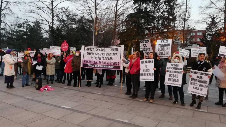 Çorlu Kadın Platformu adına yapılan basın açıklamasında krizin yükünü emekçi kadınların üzerine yıkan sermaye ve iktidara karşı mücadele çağrısının yapıldığı eylemde, kadın cinayetlerine ve kadına yönelik şiddete karşı öz savunma hakkına, iktidarın göz diktiği nafaka hakkına sahip çıkıldı. NATO saldırganlığı lanetlendi ve “kadınların da tüm insanlığın da güvende ve özgür olacağı bir gelecek için emperyalizme karşı mücadeleyi de görev biliyoruz” diyen Çorlu Kadın Platformu kadınları emperyalizme karşı mücadeleye omuz vermeye çağırdı.
