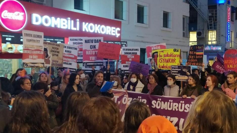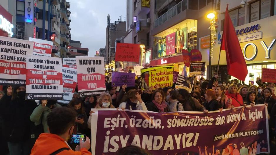 Çok sayıda siyasi parti, sendika, oda ve kadın örgütlerinden katılımla gerçekleşen yürüyüşe Devrimci İşçi Partili Kadınlar da katıldı. Devrimci İşçi Partilinden Kadınlar yürüyüşte “Emekçi kadınlar en öne!” şiarı ve “NATO’dan çık, NATO’yu yık!”, “Krizi yaratan bedelini ödesin!”, “Öz savunma haktır, yargılanamaz!” talepleriyle yer aldı. Yürüyüşün ardından basın açıklamasına geçildi. Açıklamada, krizin yükünü en çok çekenin kadınlar olduğu, en güvencesiz ve kötü şartlarda kadınların çalıştığı, ayrımcı ve şiddeti körükleyen politikalardan yine en çok kadınların etkilendiği vurgulandı. Kadınların gelen zamlar, yükselen faturalar ve sefalet ücretleriyle bir darboğazın içine çekildiği, işsizlikte ilk gözden çıkarılanların kadınlar olduğu, kadınların bu sebeple git gide daha fazla başkasına bağımlı hâle gelerek yaşamını sürdürdüğüne dikkat çekildi.