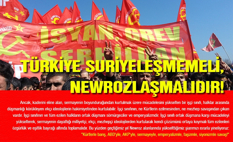 Ancak, kaderini eline alan, sermayenin boyunduruğundan kurtulmak üzere mücadelesini yükselten bir işçi sınıfı, halklar arasında düşmanlığı körükleyen ırkçı ideolojilerin hakimiyetinden kurtulabilir. İşçi sınıfının, ne Kürtlerin ezilmesinden, ne mezhep savaşından çıkarı vardır. İşçi sınıfının ve tüm ezilen halkların ortak düşmanı sömürgeciler ve emperyalizmdir. İşçi sınıfı ortak düşmana karşı mücadeleyi yükselterek, sermayenin dayattığı milliyetçi, ırkçı, mezhepçi ideolojilerden kurtularak kendi çözümünü ortaya koymalı tüm ezilenleri özgürlük ve eşitlik bayrağı altında toplamalıdır. Bu yüzden geçtiğimiz yıl Newroz alanlarında yükselttiğimiz şiarımızı ısrarla yineliyoruz: "Kürtlerle Barış, ABD'yle, AKP'yle, sermayeyle, emperyalizmle, faşizmle, Siyonizmle savaş!"