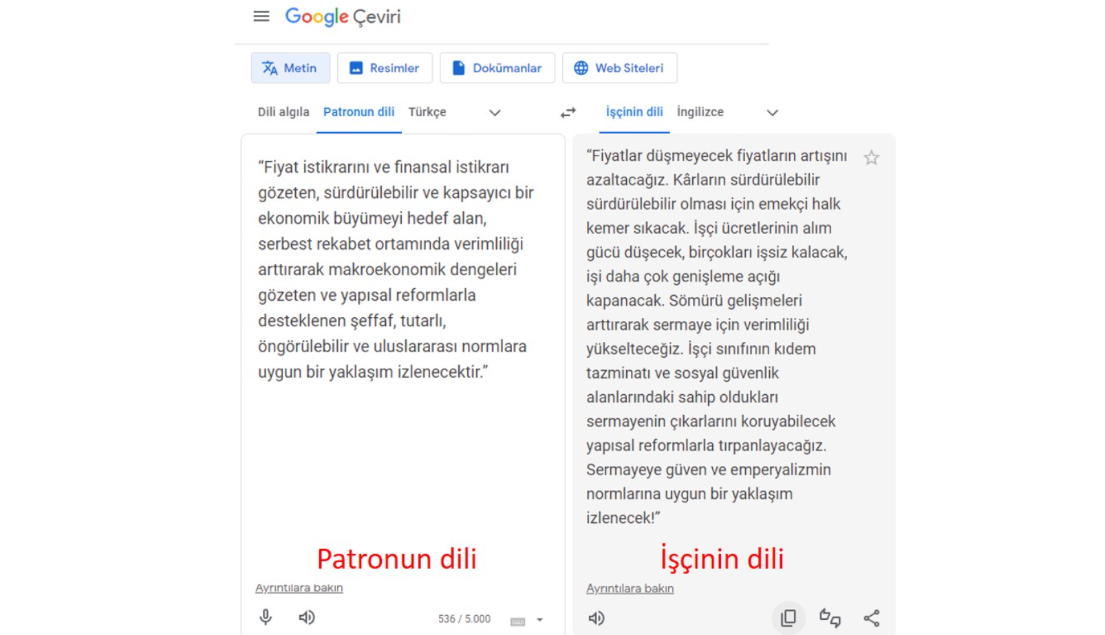 İşçinin emekçinin gözünden tercümesini yapalım: “Fiyatlar düşmeyecek, fiyatların artış hızını yavaşlatacağız. Kârların büyümesinin sürdürülebilir olması için emekçi halk kemer sıkacak. İşçi ücretlerinin alım gücü düşecek, birçokları işsiz kalacak, işi olanlar daha çok çalışarak açığı kapatacak. Sömürü oranını arttırarak sermaye için verimliliği yükselteceğiz. İşçi sınıfının kıdem tazminatı ve sosyal güvenlik alanlarındaki kazanımlarını sermayenin çıkarlarını gözeten yapısal reformlarla tırpanlayacağız. Sermayeye güven veren ve emperyalizmin normlarına uygun bir yaklaşım izlenecek!