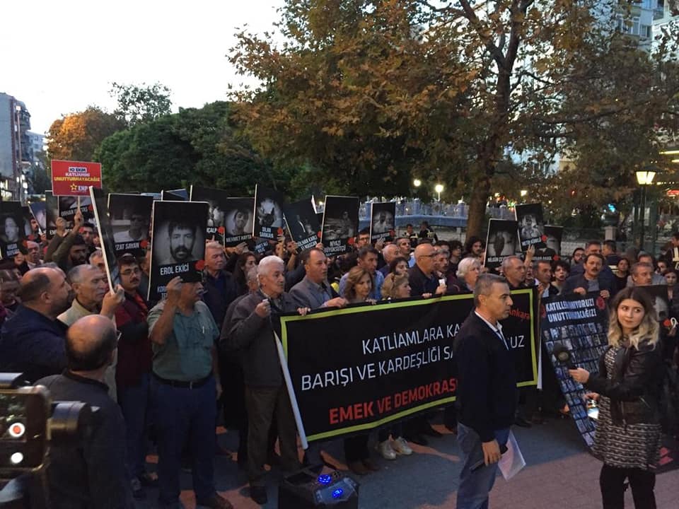İstanbul’da 10 Ekim anması ve basın açıklaması DİSK, KESK, TMMOB, TTB’nin yanı sıra pek çok siyasi parti ve demokratik kitle örgütünün yer aldığı İstanbul Emek, Demokrasi, Barış Güçleri’nin çağrısıyla Kadıköy İskele Meydanı’nda saat 19:00’da başladı.