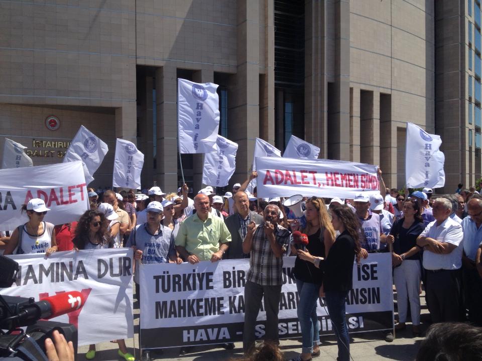 Çağlayan önündeki basın açıklamasında Hava-İş Başkanı Attilay Ayçin, “yaptığımız başvurunun, suç duyurusunun, açtığımız davaların, aldığımız kararların sayısını unuttuk” diyerek yaşadıkları durumu anlattı ve karşılarında sadece THY yönetiminin değil her türlü hukuksuzluğa arka çıkan AKP hükümetinin bulunduğunu bir kez daha vurguladı.