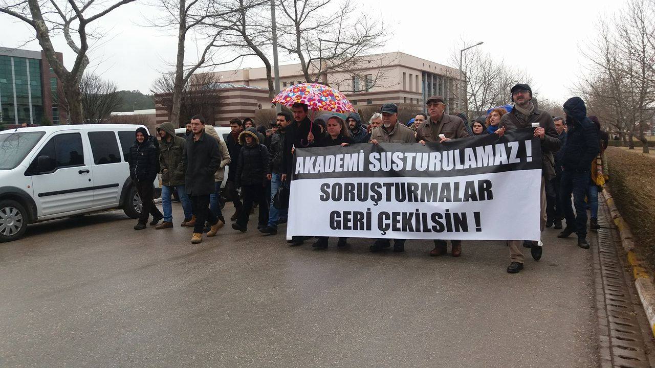 "Barış İçin Akademisyenler" metnine imza atan akademisyenlere önce linç kampanyası başlatılmış ardından da Rektörlük tarafından soruşturma açılmıştı. Akademisyenler, savunmalarını vermeden önce Rektörlük önünde bir basın açıklaması gerçekleştirdiler. Basın açıklamasının ardından Emek ve Demokrasi Güçleriyle birlikte savunmaların verileceği İktisadi ve İdari Bilimler Fakültesi önüne yürüyüş yapıldı.