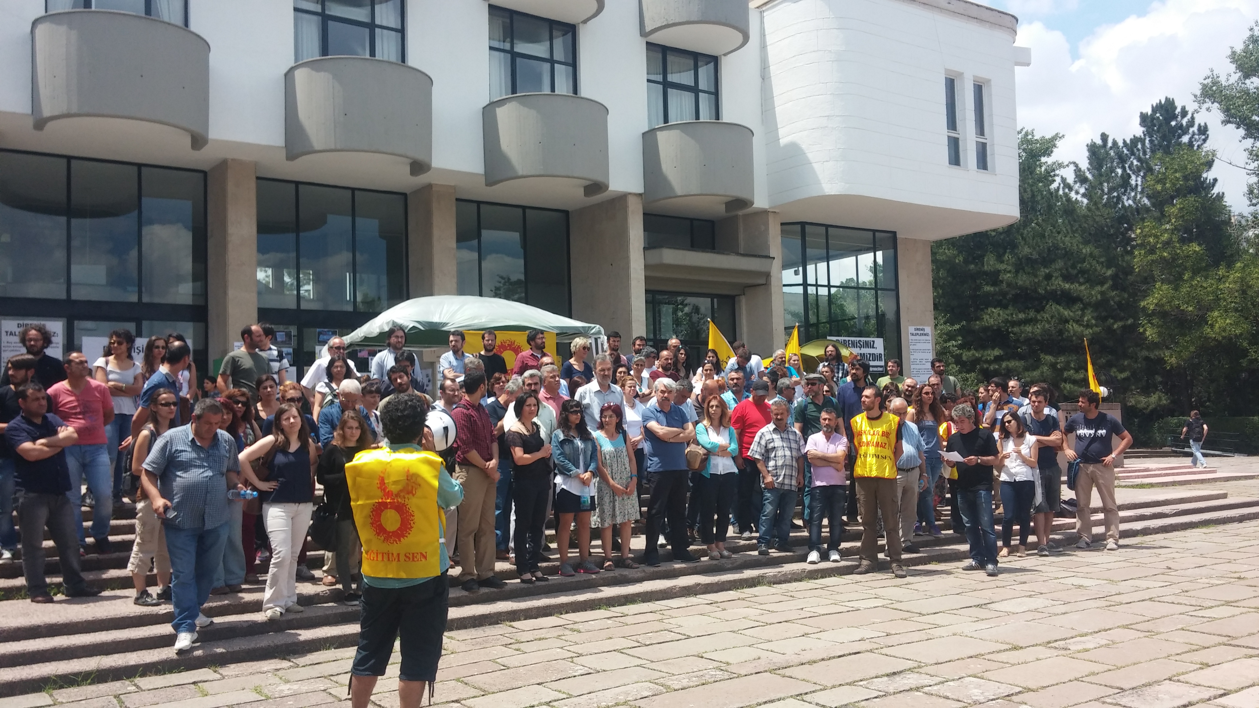 Direniş alanında imza metni Mustafa Kemal Coşkun tarafından okunurken, Raşit Tükel ve Sungur Savran da birer konuşma gerçekleştirdiler. Raşit Tükel konuşmasında baskılar karşısında tek başına verilecek mücadelenin yetersiz kalacağını belirterek ancak dayanışmanın bu tür gerici baskı ortamlarına karşı mücadeleyi kazandırabileceğini söyledi. Sungur Savran ise 12 Eylül öncesinde üniversitelerde gelişen emek mücadelesinin yükselen işçi sınıfı mücadelesi ile el ele yürüdüğünü belirterek bugün de üniversitelerde benzer bir durumun metal ve diğer sektörlerdeki mücadeleci eğilimler ile paralellik içinde ortaya çıktığını vurguladı.