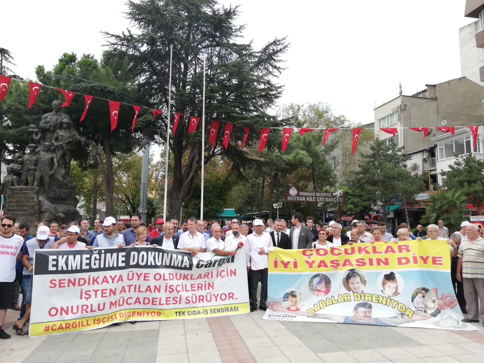 Basın açıklamasında Cargill şirketinin geçmişten gelen sendika düşmanlığı vurgulandı. Cargill işçileri 2012 yılında başka bir sendikada örgütlenmeye çalışmış fakat Cargill işvereni o dönemde de sendika üyesi 5 işçiyi işten atmıştı. Son süreçte ise sendikanın örgütlenmeyi tamamlayıp yetki başvurusunda bulunduğunu fakat Çalışma Bakanlığı’nın, yetki başvurusu talebini çoğunluk sayısına Ataşehir’deki genel müdürlük çalışanlarının da dahil edilmesi gerektiğini söyleyerek kabul etmediği açıklandı. Cargill işvereninin kota fazlalığı ve daralmayı bahane gösterdiği, asıl amacının sendikal örgütlenmeyi engellemek olduğu, işçilerin bu yasal haklarından asla vazgeçmeyeceği belirtildi. Açıklamada ‘’Kurtuluş yok tek başına,ya hep beraber ya hiçbirimiz’’,’’Direne,direne kazanacağız’’,’’Açlıktan ölmeyiz,biz bu yoldan dönmeyiz’’,’’Cargill işçisi yalnız değildir’’ sloganları atıldı.