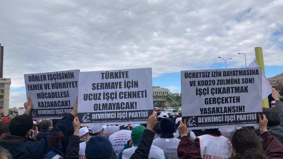 Döhler işçisinin verdiği ekmek ve hürriyet mücadelesini desteklemek ve diğer direnişçi işçilerle dayanışmayı yükseltmek için Devrimci İşçi Partisi olarak alandaydık. “Türkiye sermaye için ucuz işçi cenneti olmayacak!”, “Emperyalist zincirleri sınıf mücadelesiyle kıracağız!” ve “İşçi çıkartmak gerçekten yasaklansın!” dövizleriyle katılarak işçilerin yanında olduk ve bundan sonra da atılan işçiler işe iade edilene, sendikalar o fabrikalara girene kadar işçilerin verdiği mücadelede yanlarında olmaya devam edeceğiz.