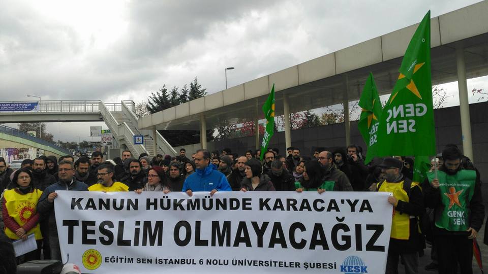Geçtiğimiz haftaİTÜ rektörlüğü, geçen yıl çıkan bir KHK’nın hukuksuz olarak verdiği yetki ile Eğitim Sen’li idari personeller Arzu Acar, Cihan Koca, Ekin Demirkan’ı ihraç etti. Akademisyen Hüseyin Mercan ve İlke Kızmaz’ı ise açığa aldı. 21 Aralık Salı günü Eğitim Sen’in çağrısıyla akademisyenler, öğrenciler ve üniversite emekçileri Ayazağa Kampüsü önünde açtıkları “Kanun Hükmünde Karaca” pankartı arkasında buluşarak, yapılan ihraçları protesto ettiler.