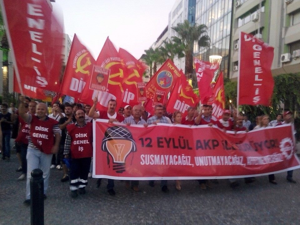 İzmir'de Konak YKM önünde saat 19:00’da 12 Eylül’ü lanetlemek üzere toplanan kitle eski Sümerbank'a yürüdü. Yürüyüş boyunca "12 Eylül AKP ile sürüyor susmayacağız, unutmayacağız affetmeyeceğiz", "12 Eylül darbesiyle hesaplaşmamız sürüyor, sürecek" yazılı pankartlar taşınırken, “Katil devlet hesap verecek”, “Yaşasın devrim ve sosyalizm”, “Yaşasın devrimci dayanışma” ve “Kurtuluş yok tek başına ya hep beraber ya hiçbirimiz” sloganları atıldı. Büyükşehir binası önünde gece gündüz direnişlerini sürdüren İzenerji işçileri önünden geçilirken “Katillerden hesabı emekçiler soracak” ve “İzenerji işçisi yalnız değildir” sloganları atıldı. Yürüyüşün ardından eski Sümerbank önüne varıldığında darbe döneminde katledilenler anısına saygı duruşunda bulunuldu.