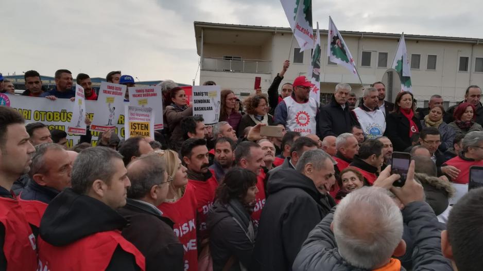 8 Şubat Cuma günü 15.00'da Çiğli Organize Sanayi Bölgesi'nde Tariş Zeytin ve Zeytinyağı fabrikası önünde polisin engelleme çabasına rağmen DİSK'in örgütleyicisi olduğu eylem düzenlendi. Eylem başlamadan önce polis, direnişteki işçiler ve eylem için işçilere desteğe gelenleri fabrika önünden yolun karşı tarafına geçirmek istedi. İşten çıkarılan Tariş işçileri direniş alanını terk etmeyeceklerini, eylem başlayınca eylem alanı olarak gösterilen yere geçeceklerini ifade ettiler. İşçilerin karşı çıkışı sonucunda işçiler fabrikanın kapısının önünde bulunan direniş alanlarında eylemi beklerken eyleme desteğe gelenler fabrikanın karşısında toplanmaya başladılar.