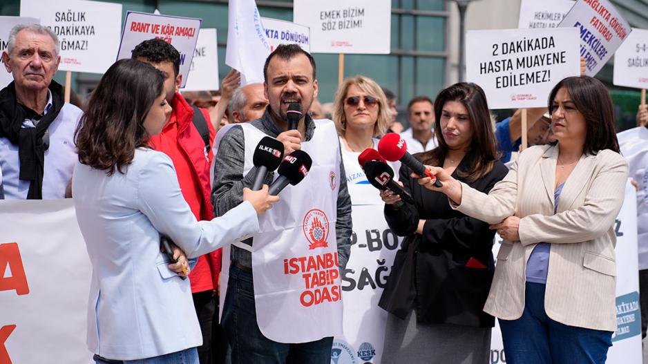 Göztepe Prof. Dr. Süleyman Yalçın Şehir Hastanesi’nde hastalara 1-2 dakika aralıklarla muayene randevusu verilmeye başlanması üzerine İstanbul Tabip Odası (İTO) ve Sağlık ve Sosyal Hizmet Emekçileri Sendikası (SES) “sağlık iki dakikaya sığmaz” diyerek harekete geçti. Sağlık emekçilerinin önde gelen iki örgütü 8 Mayıs Çarşamba günü öğlen saatlerinde hastane önünde yaptıkları ortak basın açıklamasıyla bu durumu protesto etti.