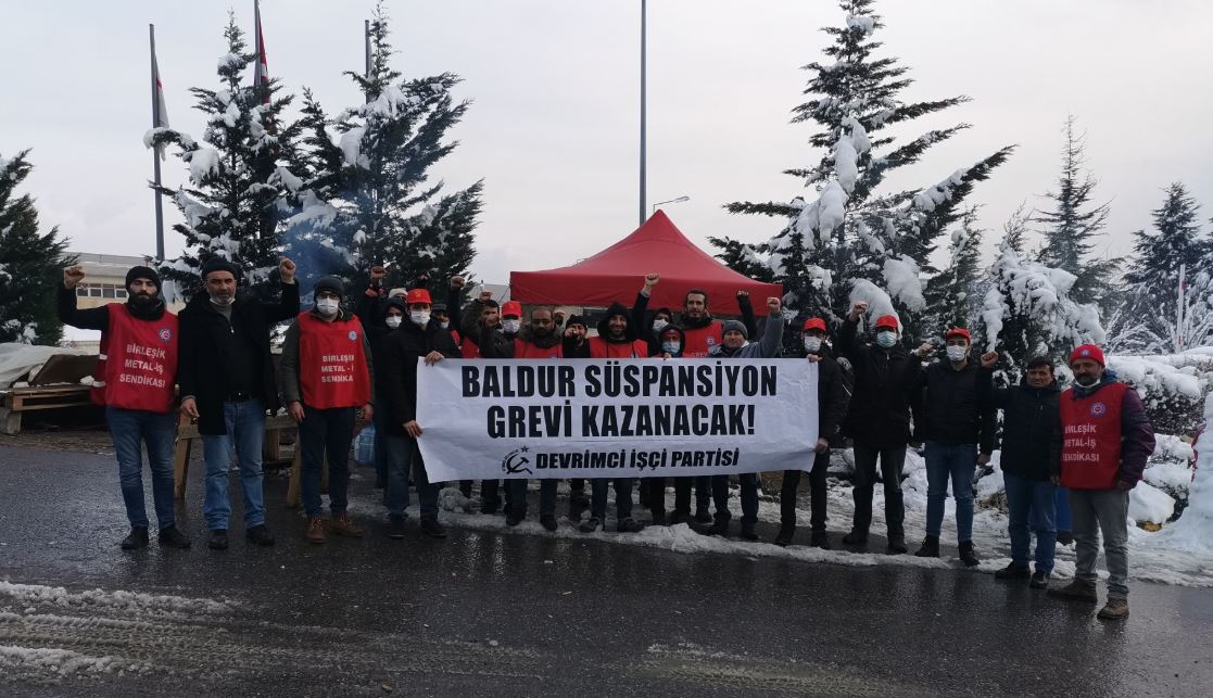 Kocaeli Çayırova’da bulunan Baldur Süspansiyon fabrikasında 25 Aralık 2020 tarihinde başlayan grevin arkasında yıllara yayılan bir mücadele var. Baldur Süspansiyon’da sendikal örgütlenme üç yıl önce başladı ve Birleşik Metal-İş sendikası fabrikada çoğunluğu sağlayarak yetki aldı. Patron sendikanın yetkisine derhâl itiraz etti. Yıllar süren davaların ardından geçtiğimiz aylarda yetki kesinleşti ve yasal toplu sözleşme süreci başladı. Patron buna rağmen sendikayı muhatap kabul etmedi. Üstüne sendikal örgütlenmede önde yer alan 5 işçiyi de ücretsiz izne çıkardı. Bunun üzerine işçiler fabrika önünde direnişe geçti. Patron yasal toplu sözleşme sürecinde sendikayı muhatap almayan tutumunda ısrar etti. İşçiler greve çıkamaz, bölünürler, kırılırlar diye düşündü. Ancak işin sonunda Baldur işçisi tam bir birlik ve beraberlik için greve çıktı ve Baldur’da şalterler indi.