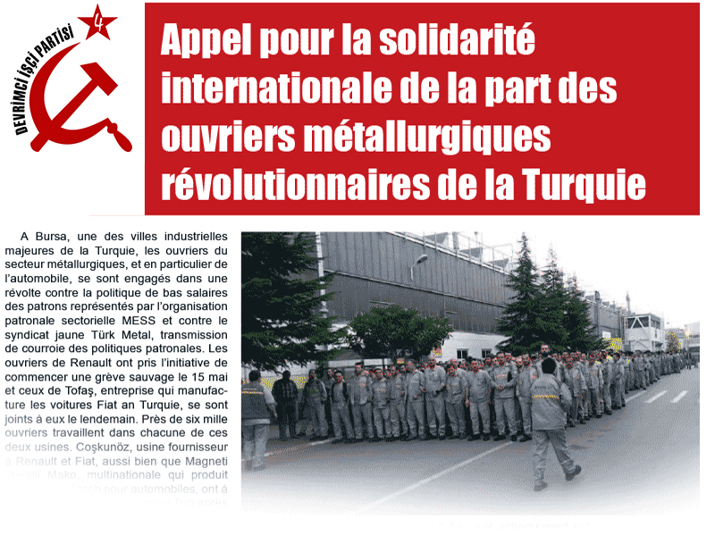 Devrimci İşçi Partisi (DİP), 15 Mayıs’ta Bursa’daki Renault fabrikasında başlayan ve daha sonra dalga dalga yayılarak birçok fabrikaya sıçrayan, halen Bursa, Kocaeli ve Ankara’da devam etmekte olan fiili metal grevi için uluslararası bir dayanışma kampanyası başlattı.