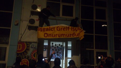 Greif Hadımköy fabrikasından bir grup işçi bugün Dudullu ve Samandıra'daki Greif ve Ünsa çuval fabrikalarına gitti. Dudullu ve Samandıra'da işgal ve direnişin sloganlarını haykıran işçiler, saat 20.30'da Şişli Cami önünde toplandılar. Şişli Cami önünde DİSK genel merkezi önüne kadar bir yürüyüş gerçekleşti. Halaskargazi Caddesi'nde yolun bir şeridini kapatan işçiler, "işgal-grev-direniş, yaşasın onurlu mücadelemiz, kahrolsun sendika ağaları, sendika işçine sahip çık, direne direne kazanacağız" sloganlarını attılar.