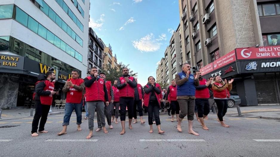 İzmir Büyükşehir Belediyesinde çalışan ve Genel-İş sendikasında örgütlü işçiler, 29 Mayıs’ta greve çıkmış, yedi gün süren grevin ardından uzlaşı sağlanarak Toplu İş Sözleşmesi (TİS) imzalanmıştı. Geçtiğimiz hafta DİSK Genel-İş sendikası İzmir 1, 2, 3 ve 9 No’lu Şubeleri tarafından yapılan açıklamada, ücretlerin zamanında yatırılmaması, eksik ve parçalı ödenmesi, ikramiye, fazla mesai, eğitim ve gıda kartı gibi ek ödemelerin bu ay yapılmaması, geriye dönük alacakların hâlâ ödenmemesi ve 370 işçinin “havuza” gönderilmesine (“Havuza göndermek”, süresiz ücretsiz izin anlamına geliyor.) tepki gösterilerek eylem planı kamuoyuna duyuruldu. 8 Aralık sabahı işçilerin yalın ayak yürüyüşüyle başlattıkları eylemler, hafta boyunca kitlesel yürüyüşler, basın açıklamaları ve iş bırakma eylemleriyle sürdü. Sendika, belediye yönetimini müzakere masasına çağırırken işçiler, kazanılmış haklarını alıncaya ve “havuza” gönderilen işçiler işlerine iade edilinceye kadar mücadeleye devam edeceklerini duyurdu ve önümüzdeki hafta için eylem planını açıkladı.