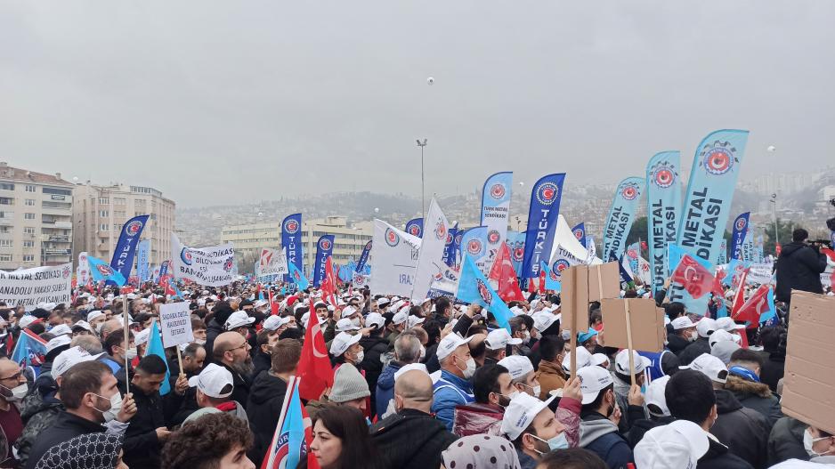 Metal işçileri 130 bin işçiyi kapsayan MESS grup toplu iş sözleşmesi sürecinde MESS patronlarının dayattığı sefalet ücretlerine karşı 2 Ocak Pazar günü Kocaeli Kent Meydanı’nda bir araya geldi. Türk Metal üyesi binlerce işçi, yağmur soğuk demeden “Ölümüne çalıştık, şimdi kazanacağız!” parolasıyla bir araya gelirken, Türk-İş’e bağlı diğer sendikalardan gelen işçiler de sınıf dayanışması göstererek bu süreçte metal işçilerinin yanında olacağını gösterdi.