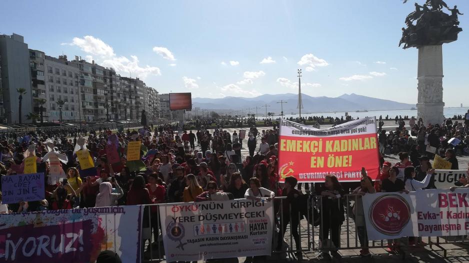 8 Mart Dünya Emekçi Kadınlar Günü nedeniyle İzmir’de miting düzenlendi. İşçi emekçi kadınların daha rahat katılabilmesi için 10 Mart Pazar günü yapılan miting Cumhuriyet Meydanı’ndan yürüyüş ile başladı. Saat 14:00’te Cumhuriyet meydanında toplanan kadınlar miting için Gündoğdu’ya yürüdü. Devrimci İşçi Partisi yürüyüşe ve mitinge “İstibdada, sömürüye, erkek egemenliğine, emperyalizme karşı orta yol yok! Emekçi kadınlar en öne!” yazılı pankart ile katıldı. Yürüyüş esnasında Devrimci İşçi Partisi kortejinde sık sık “Kapitalizme, emperyalizme, istibdada ve sömürüye orta yol yok”, “Kahrolsun erkek egemen kapitalist sistem” sloganları atıldı. Gündoğdu’da tamamlanan yürüyüş sonrasında emekçi kadınlar kürsüsünden işçi kadınlar kitleye seslendi. Yapılan konuşmalarda sendikal örgütlülüğün önemi ve mücadelenin devamlılığına değinildi. Ege Üniversitesi’nde işten çıkarılan bir kadın işçi, bu baskı yönetiminin ancak emekçi kadınların mücadelesini büyüterek yıkılacağını vurgulayarak sendikal örgütlenme çağrısı yaptı. İşçi kadınların konuşmaları ve mesajları sonrasında basın açıklaması okundu.