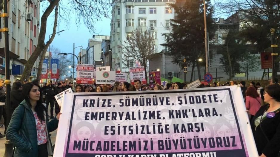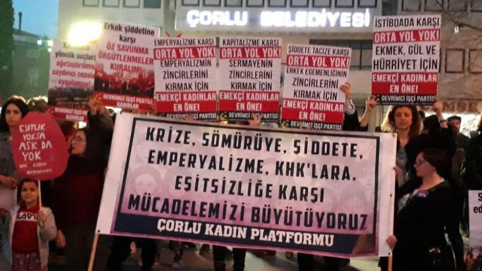 8 Mart Dünya Emekçi Kadınlar Günü'nde Çorlu Kadın Platformu 18:30'da Heykel Meydanı'nda toplandı ve "Krize, sömürüye, şiddete, emperyalizme, KHK'lara ve eşitsizliğe karşı mücadelemizi büyütüyoruz!" pankartı ile Belediye Meydanı'na yürüdü. Çorlu Kadın Platformu'nun eylemine Tekirdağ Barosu ve Eğitim-İş sendikası da destek verdi.