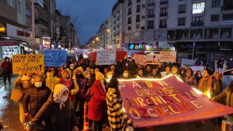 Çok sayıda siyasi parti, sendika, oda ve kadın örgütlerinden katılımla gerçekleşen yürüyüşe Devrimci İşçi Partili Kadınlar da katıldı. Devrimci İşçi Partilinden Kadınlar yürüyüşte “Emekçi kadınlar en öne!” şiarı ve “NATO’dan çık, NATO’yu yık!”, “Krizi yaratan bedelini ödesin!”, “Öz savunma haktır, yargılanamaz!” talepleriyle yer aldı. Yürüyüşün ardından basın açıklamasına geçildi. Açıklamada, krizin yükünü en çok çekenin kadınlar olduğu, en güvencesiz ve kötü şartlarda kadınların çalıştığı, ayrımcı ve şiddeti körükleyen politikalardan yine en çok kadınların etkilendiği vurgulandı. Kadınların gelen zamlar, yükselen faturalar ve sefalet ücretleriyle bir darboğazın içine çekildiği, işsizlikte ilk gözden çıkarılanların kadınlar olduğu, kadınların bu sebeple git gide daha fazla başkasına bağımlı hâle gelerek yaşamını sürdürdüğüne dikkat çekildi.