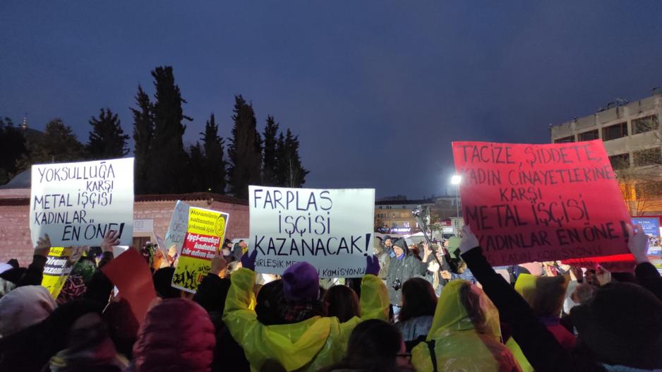 Gebze’de 8 Mart’a başta metal işçisi kadınlar damgasını vurdu. Birleşik Metal-İş Gebze Şubesi’nin Kadın Komisyonu Dünya Emekçi Kadınlar Günü’nde Farplas direnişçisi işçilerle bir araya geldi. Birleşik Metal’li kadınlar, sendikalı oldukları ve fabrikalarında üretimden gelen güçlerini kullandıkları için işten atılan, bunun için fabrika önünde direnen işçilerin çadırına güçlü bir kortejle yürüdü. Akşam ise Gebze Kadın Platformu’nun örgütlediği eylem için pek çok sektörden emekçi kadın Trafo Meydan’da buluştu. Birleşik Metal-İş Kadın Komisyonu’ndan kadınlar eylemde metal işçisi kadınları mücadelenin en önüne çağıran, erkek egemen kapitalist sisteme ve emperyalizme karşı işçi kadınların taleplerini yükselten dövizler taşıdı. Polisin bütün engellemelerine rağmen, emekçi kadınlar yumruklarını kaldırarak Kent Meydanı’na yürüdüler. Meydanda bir basın açıklaması gerçekleştirerek bütün kadınlara mücadeleyi yükseltme çağrısında bulundular.