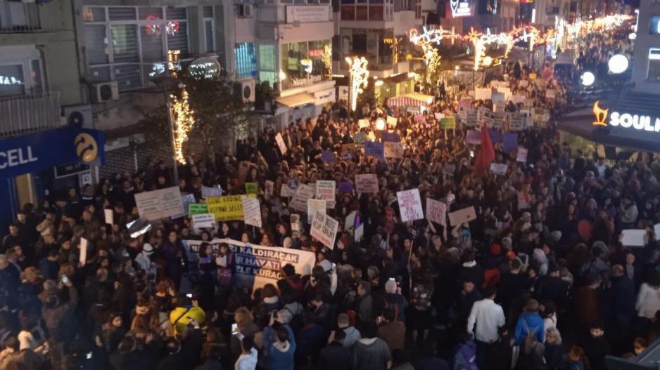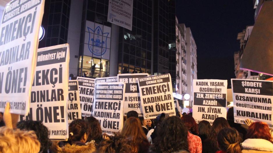 İzmir’de binlerce kadın 8 Mart Dünya Emekçi Kadınlar Günü için sokağa çıktı, hep bir ağızdan attıkları sloganlarla taleplerini ve öfkelerini haykırdı. İzmir Kadın Platformu’nun çağrısı ile Kıbrıs Şehitleri Caddesi’nde buluşan kadınlar, “Bu enkazı kaldıracak, yeni bir hayatı mücadelemizle kuracağız” yazılı pankart arkasında yürüyüşe başladı. Binlerce kadının katıldığı yürüyüşte coşku bir an bile düşmezken sık sık “Hükümet istifa”, “Kadınlar yürüyor mücadele büyüyor”, “AKP halka hesap verecek” ve “Yaşasın kadın dayanışması” sloganları atıldı. Devrimci İşçi Partili kadınlar yürüyüşe; grevde, direnişte, siyasette, devrimde emekçi kadınları en öne davet eden dövizleriyle katıldı.