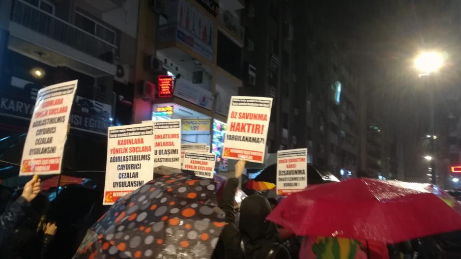 İzmir'de yüzlerce kadın, 25 Kasım Kadına Yönelik Şiddete Karşı Mücadele Günü nedeniyle sokağa çıktı. İzmir Kadın Platformu'nun çağrısıyla, 25 Kasım günü saat 18.30'da Alsancak ÖSYM önünde toplanan kadınlar, “Şiddetsiz, krizsiz, sömürüsüz ve savaşsız yaşamak istiyoruz” pankartı arkasında şiddetli yağmura rağmen şiddete, tacize, tecavüze karşı yürüdü. Kıbrıs Şehitleri Caddesi boyunca süren yürüyüşte, sık sık “Yaşasın kadın dayanışması!”, “Krizi yaratan bedelini ödesin” ve “Özsavunma haktır, yargılanmaz” sloganlarını attılar. Devrimci İşçi Partili Kadınlar, yürüyüşte taşıdıkları dövizlerle “İyi hal indirimi kaldırılsın!”, “Erkek şiddetine karşı özsavunma örgütlenmeleri kuralım!”, “Özsavunma haktır, yargılanamaz!”, “Kadına karşı taciz ve tecavüzde haksız tahrik indirimine son!” taleplerini yükseltti.