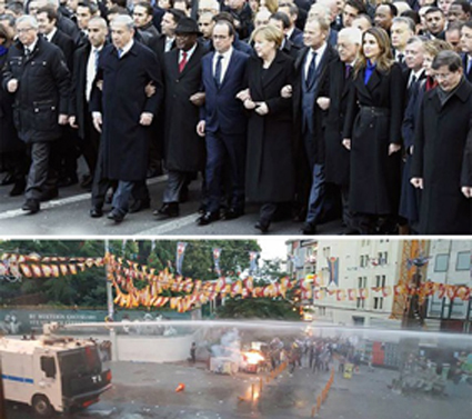 Kimler yoktu ki bu siyasi liderlerin içinde! Ortadoğu halklarından milyonlarca insanın ölümüne neden olmuş emperyalist İngiltere’nin Başbakanı David Cameron, Yunan halkının boğazına yapışmış Avrupa’nın yeni demir leydisi Angela Merkel, Ukrayna faşistlerinin koruyucusu Petro Poroşenko, yıllardır Filistin halkını sistemli olarak katleden ve topraklarını işgal etmeye devam eden Siyonist İsrail’in Başbakanı Benyamin Netanyahu ve DAİŞ’i besleyip büyüten, koruyup kollayan AKP hükümetinin Başbakanı Ahmet Davutoğlu! Ve daha niceleri... İşte o ilk fotoğraf, dünya halklarının baş düşmanları olan emperyalist ve Siyonistleri de barındıran bu katiller, tefeciler çetesinin, ikiyüzlü bir şekilde dünyaya “barış” mesajları verdiği eylemdendi.