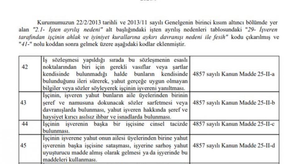 Yani söz konusu genelgeyle işçilerin ve sendikaların talepleri karşılanmıyor. Tam tersine yaşanan haksızlıkları katmerlendirecek bir yol açılıyor. Bunun başlıca nedeni Kod 29’un bir sonuç olması ve bu sonucu yaratan sebebin yani işçinin iş güvencesini gasbeden, patrona iftira atma olanağı tanıyan İş Kanunu’nun 25/2. maddesinin yerli yerinde durmasıdır. Bu durumda işçinin işini, ekmeğini ve onurunu savunması yine ancak bilinçlenerek ve örgütlü mücadeleyle mümkün olabilir. Öncelikle cinsel taciz, hırsızlık, uyuşturucu gibi konular, iş akdinin feshinin dışında adli ceza gerektiren konulardır. Patron kesinleşmiş yargı kararı olmaksızın işçiyi bu suçlarla ilgili kodlarla işten atarsa, işçinin iftira davası açma hakkı doğacaktır. Bu durumda işçiler patronlara, mutlaka iftira davası açacaklarını ve iftiranın cezasının 1 ila 4 yıl hapis olduğunu hatırlatmalıdır. İşçiler asla tehdit ve şantajlara boyun eğmemeli, haksızlığa uğradıklarında mutlaka işe iade davası yanında iftira davası da açmalıdır.