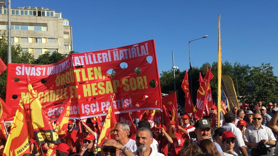 Sivas katliamının 26. yılında, Madımak otelinde hayatını kaybedenleri anmak ve katliamın sorumlularını protesto etmek amacıyla Ankara’da bir miting düzenlendi. Pir Sultan Abdal Derneği’nin çağrıcısı olduğu mitinge Alevi derneklerinin yanı sıra siyasi partiler ve demokratik kitle örgütleri de katıldı. Devrimci İşçi Partisi olarak biz de mitinge “Sivas’ı unutma! Katilleri hatırla! Örgütlen, mücadele et, hesap sor!” pankartıyla katıldık.