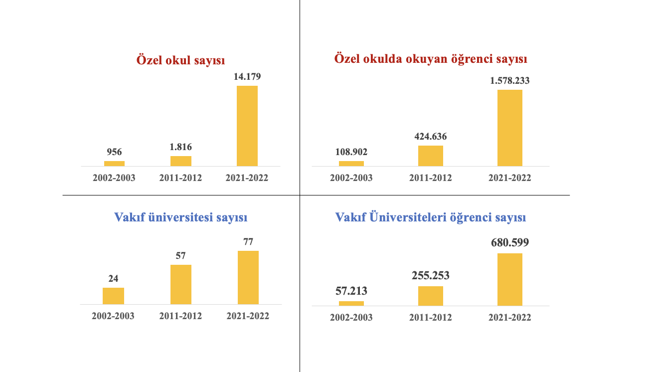 Yaklaşık 21 yıllık AKP iktidarının Türkiye’yi bir şirket gibi yönetmesinden kamusal eğitim de elbette fazlasıyla zarar gördü. 2002-2003 eğitim-öğretim yılında özel okul öğrenci sayısı toplam öğrenci sayısının %1’iyken, 8 katına çıkarak 2021-2022 de %8’i aştı. 2002’de %2 olan özel okul oranı, 10 katına çıkarak 2022’de %20’yi aştı. 2002-2003 eğitim-öğretim yılında vakıf üniversitesi öğrenci sayısı toplam öğrenci sayısının %3,5’i iken, 2021-2022’de bu oran %8’den fazla. Bugün, üniversitelerin toplam sayısı içinde vakıf üniversitelerinin oranı %37’nin üzerinde.