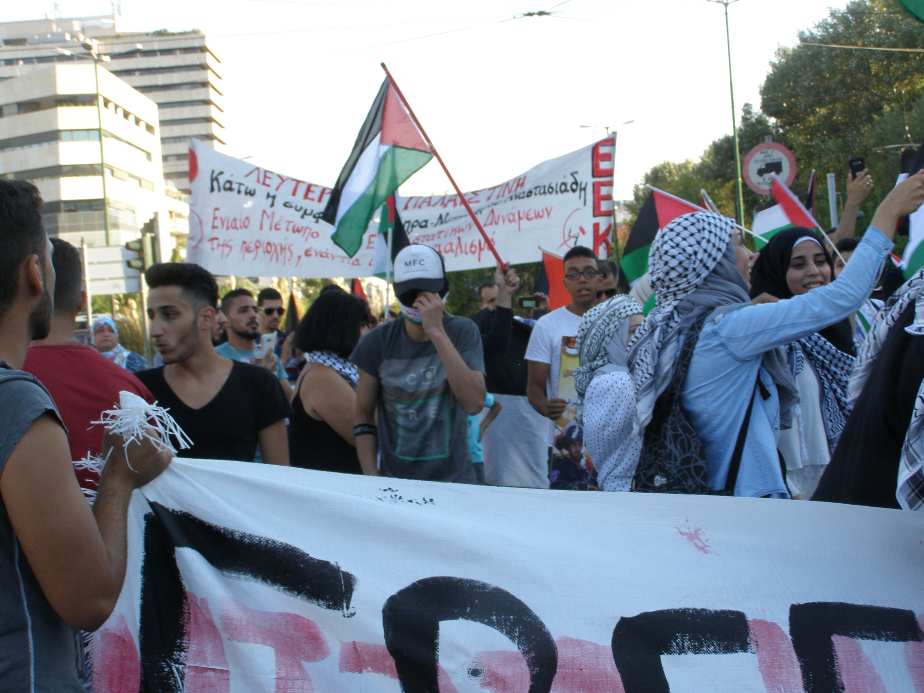 EEK militanları yürüyüş boyunca ve elçilik önünde “Filistin’e özgürlük! Kahrolsun Çipras-Netanyahu-Anastasiadis ittifakı! Emperyalizme karşı bölgenin devrimci güçlerinin birleşik cephesi!” yazılı pankartı taşıyarak, Akdeniz bölgesinin devrimci güçlerini Siyonizm’e ve emperyalizme karşı güç birliğini oluşturmaya çağırdı. Ayrıca Kahrolsun Çipras-Netanyahu-Anastasiadis ittifakı diyerek, Haziran ayında Selanik’te İsrail, Yunanistan ve Güney Kıbrıs arasında düzenlenen zirve ile somutlaşan gerici ittifaka karşı çıkmış oldu. Zira İsrail başbakanı Benjamin Netanyahu 15 Haziran’da Selanik’e gelerek üçlü zirveye katılmış, üç ülke arasında ekonomik ve siyasi işbirliğini arttırmak üzere görüşmeler yapmıştı. Zirveyle eş zamanlı olarak Atina ve Selanik’te kitlesel eylemler düzenlenmiş, Filistin diasporası ve Yunanistan solu “Netanyahu defol!” demişti. (bknz.http://gercekgazetesi.net/uluslararasi/atina-ve-selanikte-ortak-eylem-siyonist-netanyahu-yunanistandan-defol) EEK’in Filistinlilerin ulusal haklarının ve inanç özgürlüğünün ayaklar altına alınması karşısında Filistinlilerle birlikte eyleme geçmesi, meselenin dinler arası bir çatışma değil, emperyalizm tarafından desteklenen Siyonist işgalcinin karşısında ezilen bir halk olarak Filistinlilerin haklarının savunulması olduğunu, işçi sınıfı devrimcilerinin ezilen Filistin halkının esas dostu olduğunu gösteriyor.