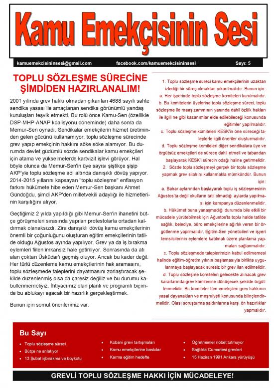Kamu Emekçisinin Sesi Sayı 5 kes_5.pdf Kamu emekçileri tarafından hazırlanan Kamu Emekçisinin Sesi bülteninin 5. sayısı çıktı!
