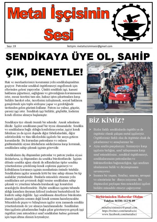 Metal İşçisinin Sesi Sayı 19 Metal İşçisinin Sesi bülteni sayı 19'yi buradan indirebilirsiniz. Metal İşçisinin Sesi'ni Facebook'tan takip etmek için tıklayın.